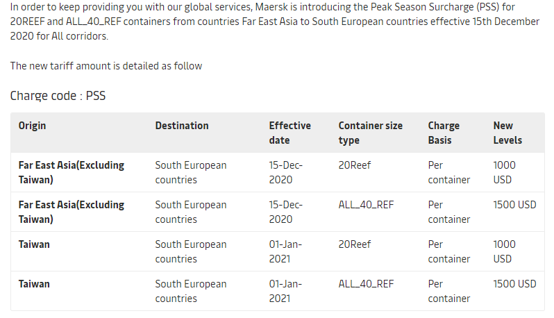 Maersk, the biggest shipping line, announced that it had introduced a new peak season surcharge (PSS) in Europe and East Asia from December to next year. Suitable for refrigerated goods from the far east to northern and southern European countries. The surcharge will be $1000/20 'freezers and $1500/40' freezers and will take effect on December 15, Taiwan PSS will take effect on January 1, 2021.