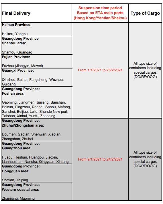 Due to the COVID-19 quarantine requirements for crews on coastal feeder ships between South China and Hong Kong, the feeder operator has announced the suspension of its services from mid-January to the end of February 2021. In view of this situation, the acceptance of all container types, including dangerous cargo boxes, refrigerators and heavy cargo bound for the ports of South China, Guangxi and Fujian will be suspended. Through the major ports of South China, the booking arrangement will be suspended as shown in the following table: